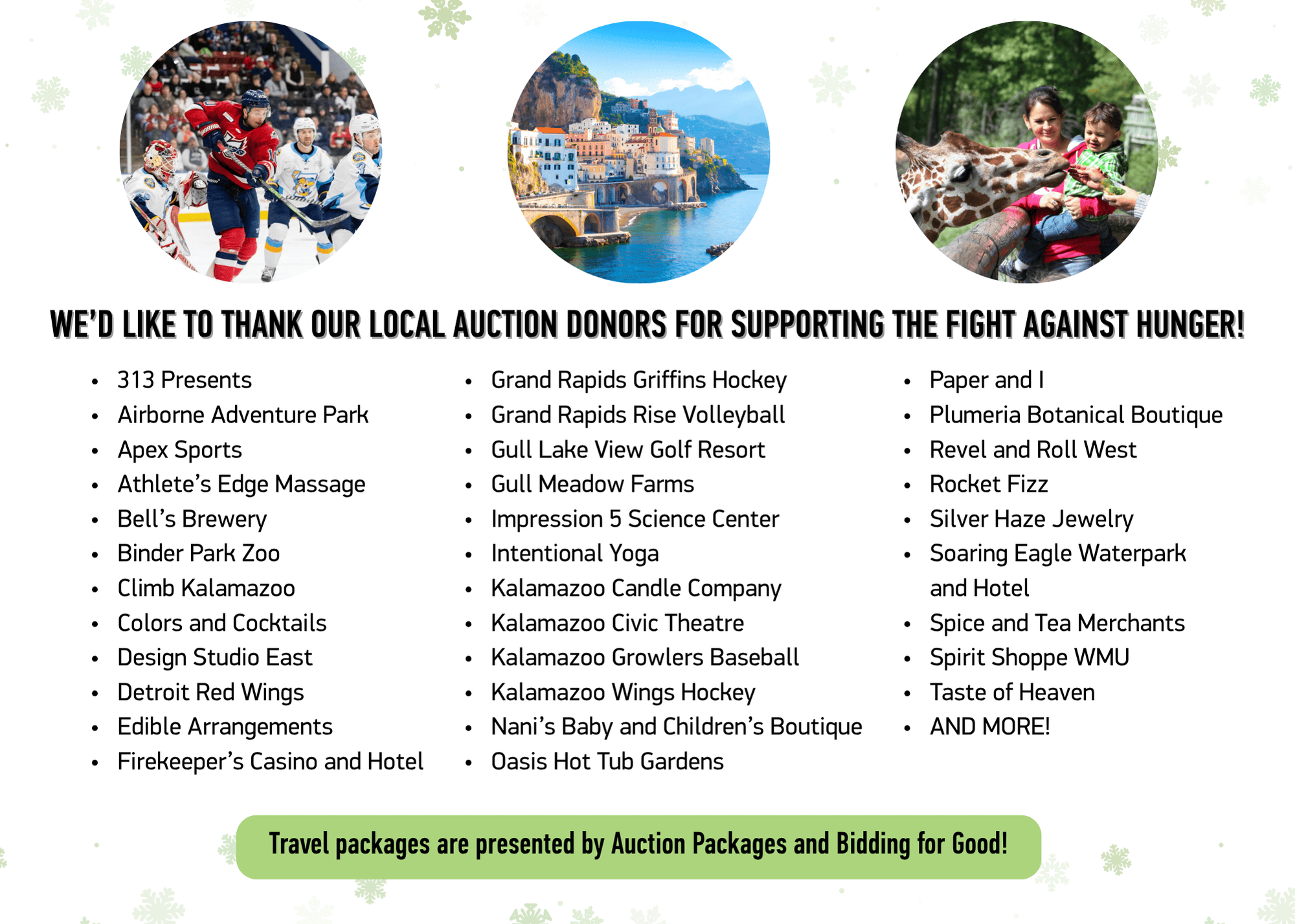 For twelve days leading up to the holidays, we’ll have unique auction items to bid on, including luxurious travel packages that are presented by Auction Packages and Bidding for Good. We’ll also have local experiences, gift baskets, sports tickets, and more, all donated by generous community partners who believe in our mission.